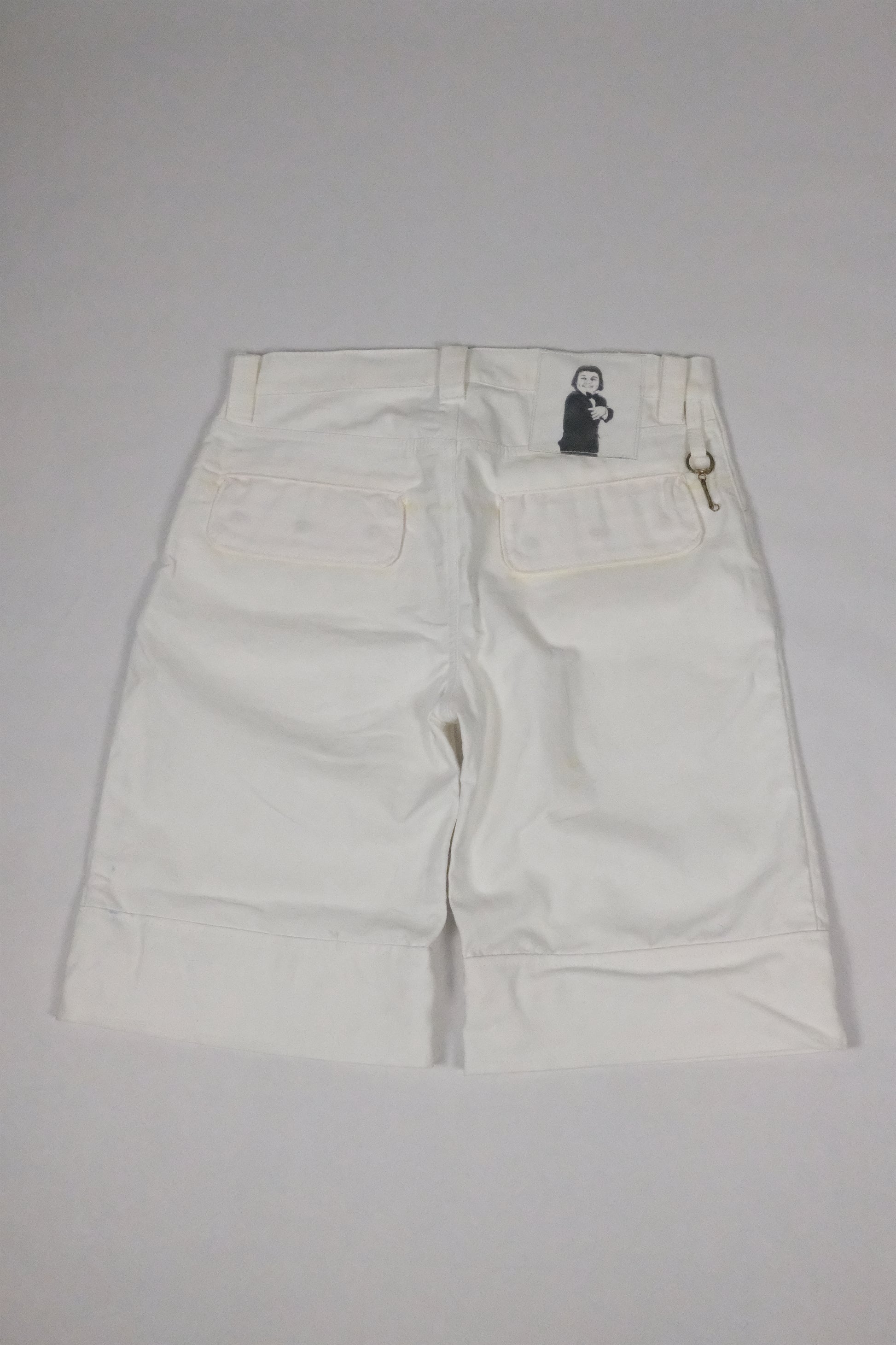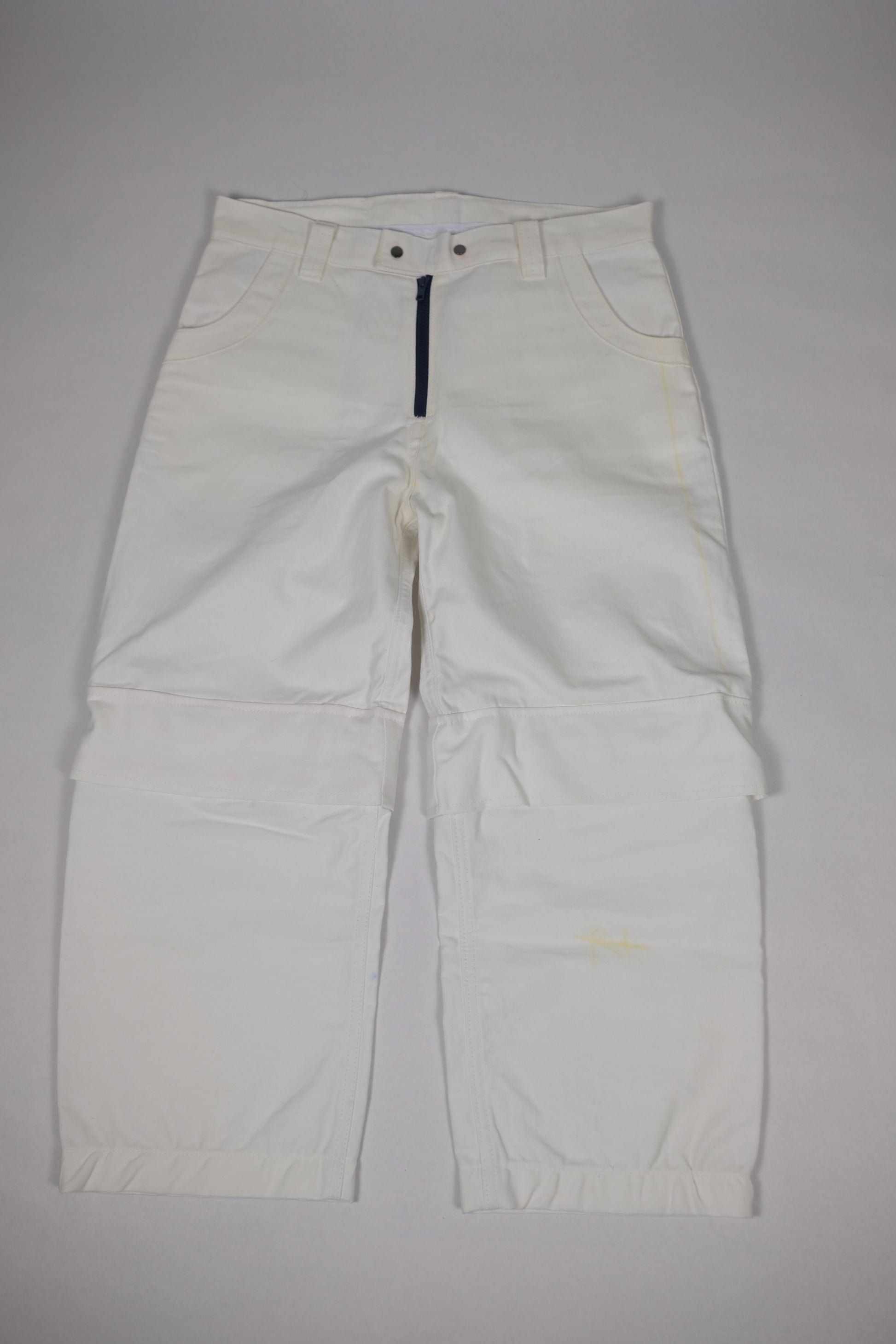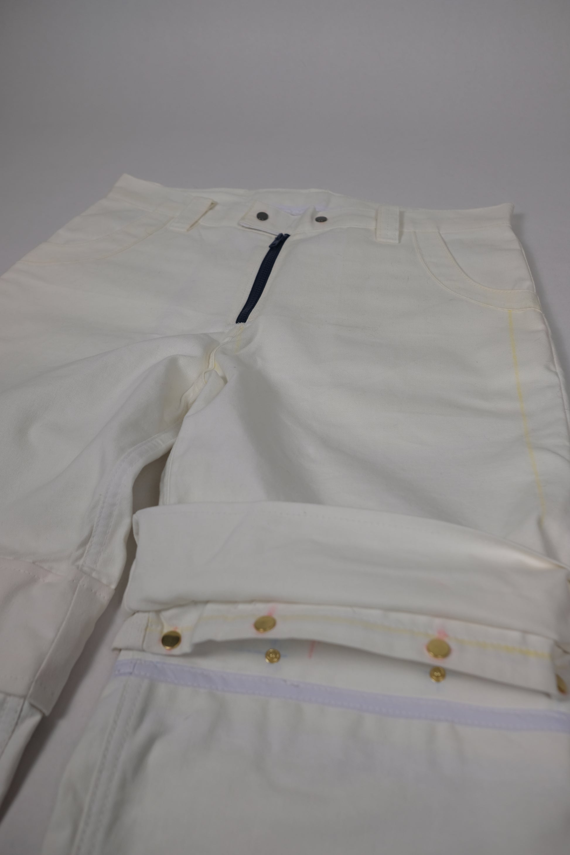 Convertible white cargo's cut and sewn by Gage. These feature detatchable legs, zipper fly, and printed back tab.