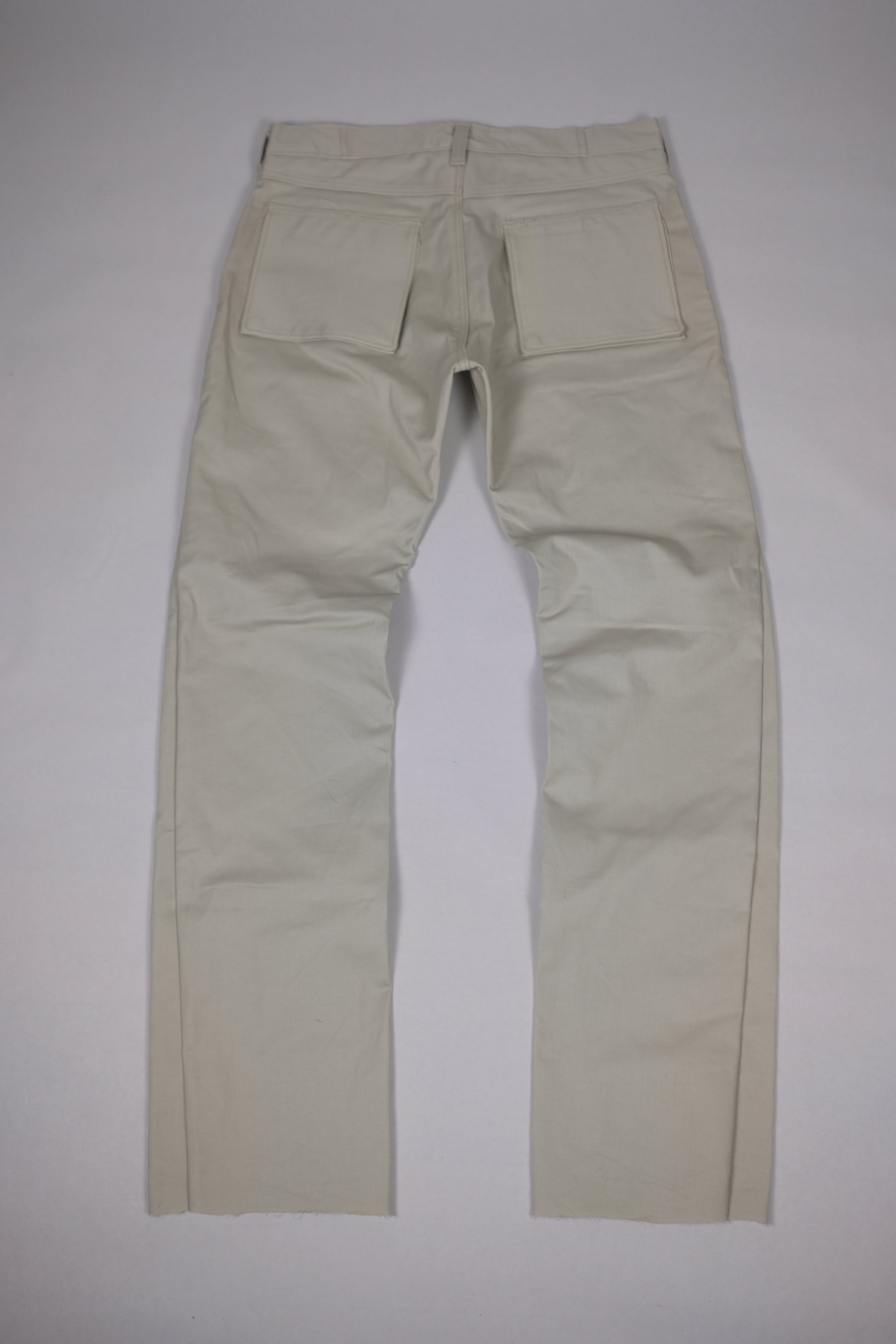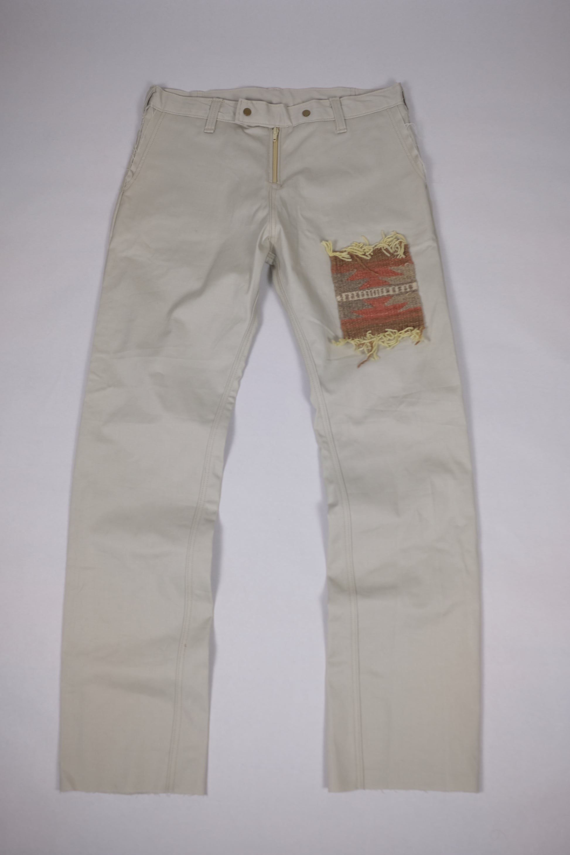 Cut and sewn tan denim by trace, featuring a tribal patch on the front. Cargo pockets on the back pockets are sewn into a welt.