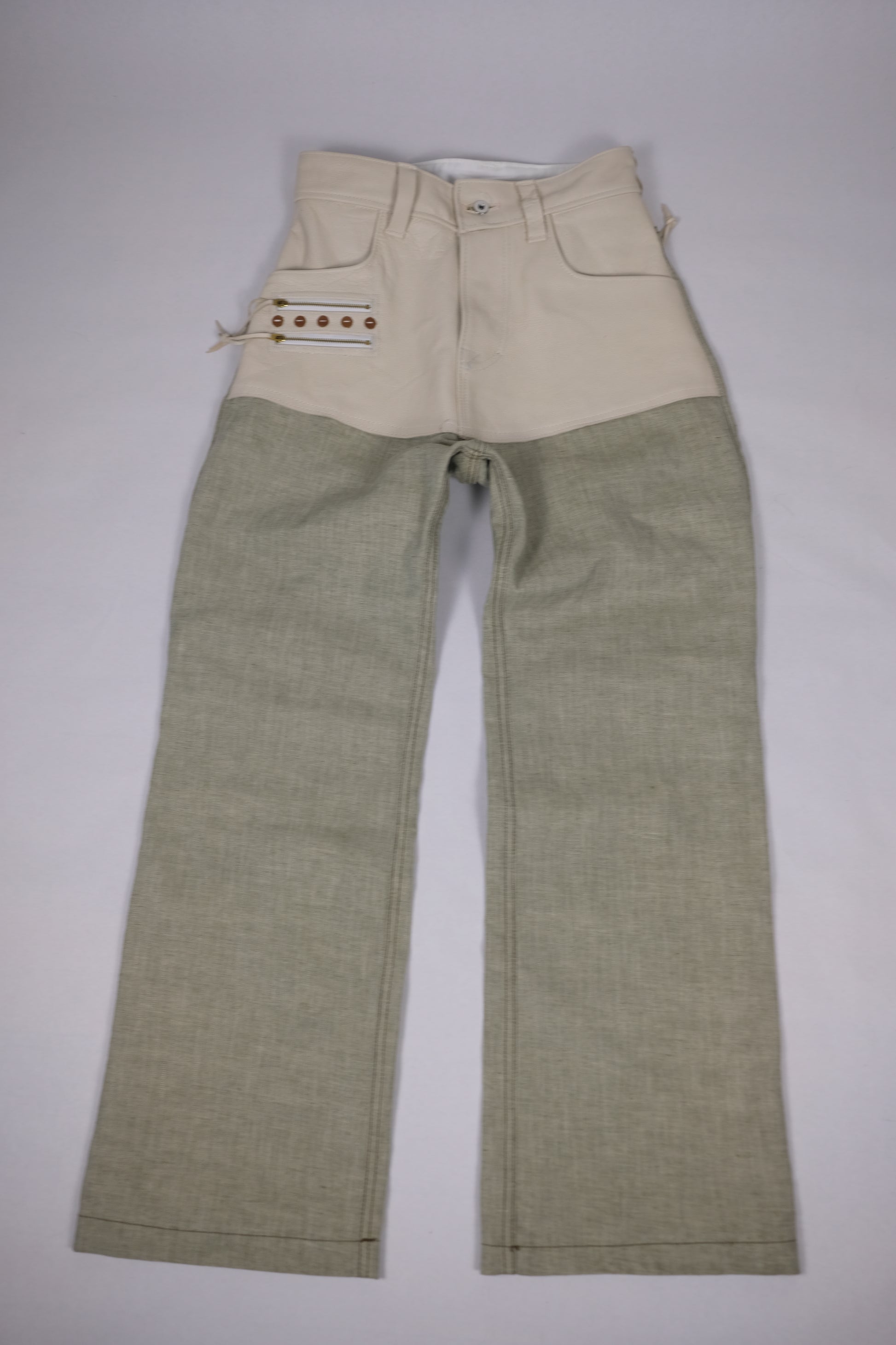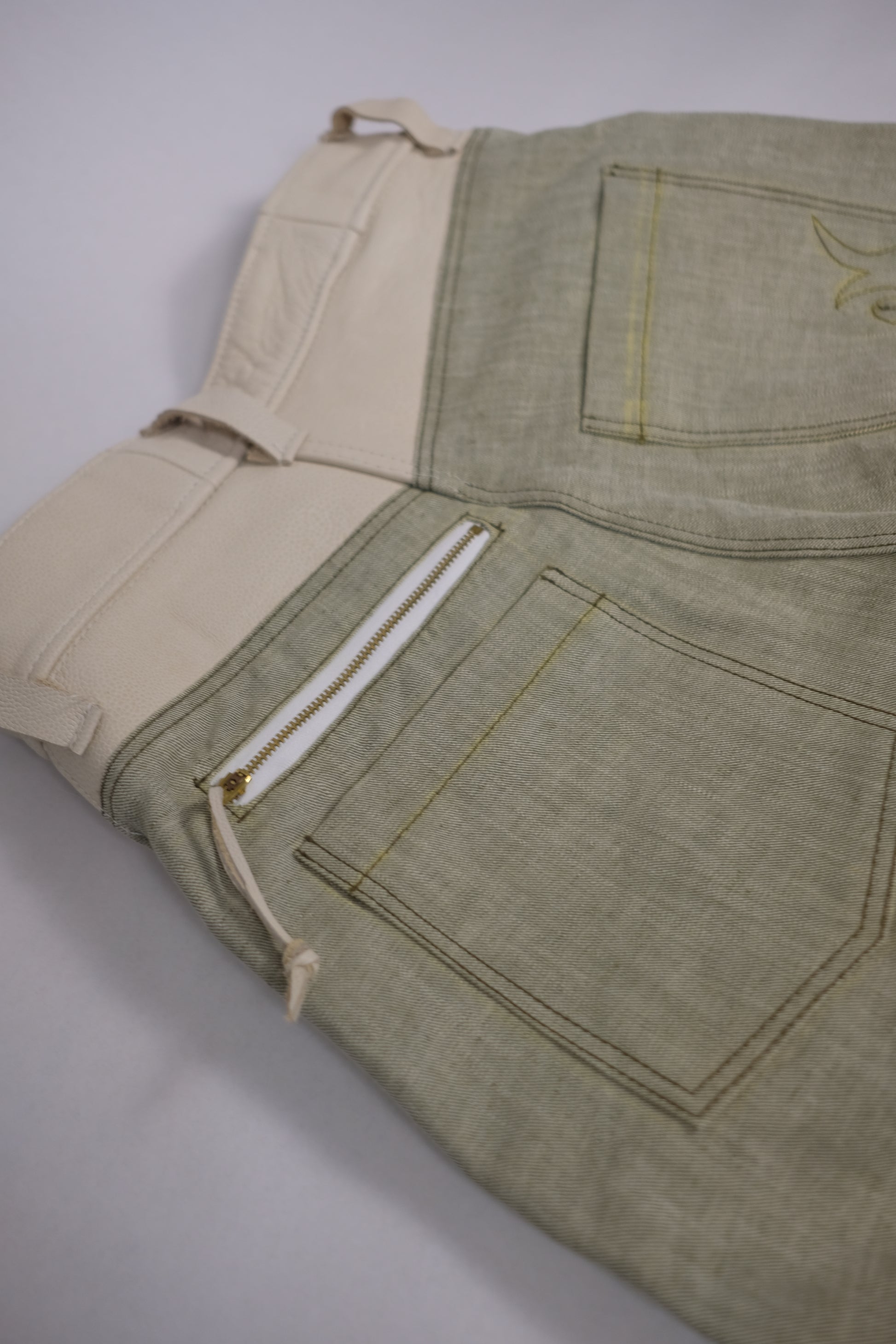 Cut and sewn 12oz white denim jeans with leather details all over. The top half of the jeans are all leather with two zipper pockets. There's a zipper pocket above the back pocket, and they feature a snap button fly.
